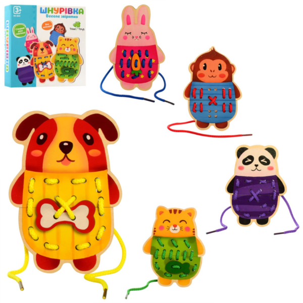 Шнурівка з веселими дерев’яними блоками прискорює розвиток ручної координації та дрібної моторики дітей. Разом з нею малята вчаться уважності, терпіння, сприяють розвитку посидючості. Шнурівка – яскравий приклад того, що навчальна проста іграшка може стати для дитини потужним інструментом розвитку. Вона не тільки познайомить малюка з новими кольорами і формами, але і зміцнить пальчики і кисті рук, готуючи їх до письма. У наборі 12 фігурок і шнурівка з дерев’яними кінцями.