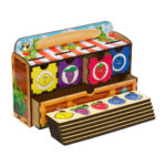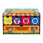 Комодик складається з 4 тематичних шухлядок для сортування вкладишів за кольором, малюнком і 1 шухлядки, де знаходяться планки для вкладання. У наборі 6 планок і 30 фігур ягід для сортування.