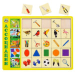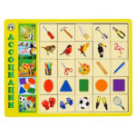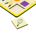 Дерев’яний планшет-рамка, на якому зображені п’ять різних картинок. Квадрати в ряд (всього 5 рядів – 25 плашок) з предметами або персонажами з картинок. Необхідно правильно зібрати 5 рядів плашок із зображенням предметів і персонажів.