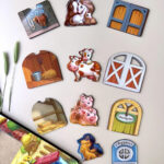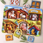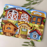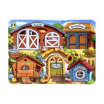 6 сімей тварин (мама і малюк), які живуть на фермі. Необхідно знайти кожній тварині її тематичний будинок. У будиночках спеціально є деталі, які підходять саме його жителю, можна рахувати тварин. Вкладиші зручно діставати пальчиками.
