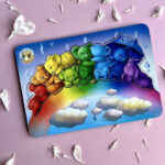 Звіропазл складається з 8-ми мишок-вкладишів, які сидять на веселці, кожна мишка біля свого кольору веселки. Але є одна хитрість: в веселці сім кольорів, а мишок вісім. Потрібно посадити всіх мишок на свої місця.