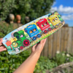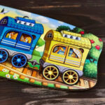 У наборі 3 вагони і локомотив, всі деталі взаємозамінні. Кожен вагон індивідуальний по дизайну, виймаються звірі і багаж, двері у вагонах праві і ліві, колеса 3-х розмірів: наочно показуємо розміри “великий”, “середній”, “маленький”. Повторюємо основні кольори:”Посади жирафа в блакитний вагон і накрий жовтим дахом, додай червоні коліщатка”. Розповідаємо малюкові, що поїзд складається з локомотива і вагонів. Що за професія машиніст, хто такі пасажири і що таке багаж. Розгляньте наші вагончики і розкажіть, що вагон може бути вантажним і пасажирським.