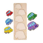 У наборі 5 машинок різного розміру і кольору. Вивчаються поняття “великий” і “маленький” і рахунок 1-5. Вкладиші зручно діставати пальчиками і вкладати в планшет за розміром.