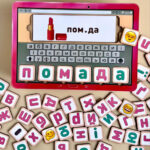 Дитині необхідно вибрати картку і скласти з букв слово, яке на ній намальовано. Збираємо слова, вчимо букви і склади, рахуємо і сортуємо букви.