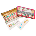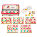 Розмір коробки: 16 х 23 х 5 см. У наборі: основа-планшет, 74 плашки з буквами, 2 плашки-знака і 84 картки з картинками різної тематики: звуки тварин, пори року, спорт, продукти, частини тіла, рослини, погода і т. п.