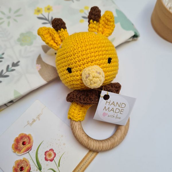 В’язане брязкальце ручної роботи “Жирафик” з комірцем оливкового цвета – ідеальна іграшка для найменших!