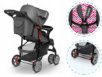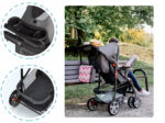 М'який матрац, регульована спинка, гальмо на задній осі, 5 — ті точкові ремені безпеки, захист від раптового складання, тримач для чашок, великий козирок із віконцем, великий і місткий кошик, легке збирання та розбирання.