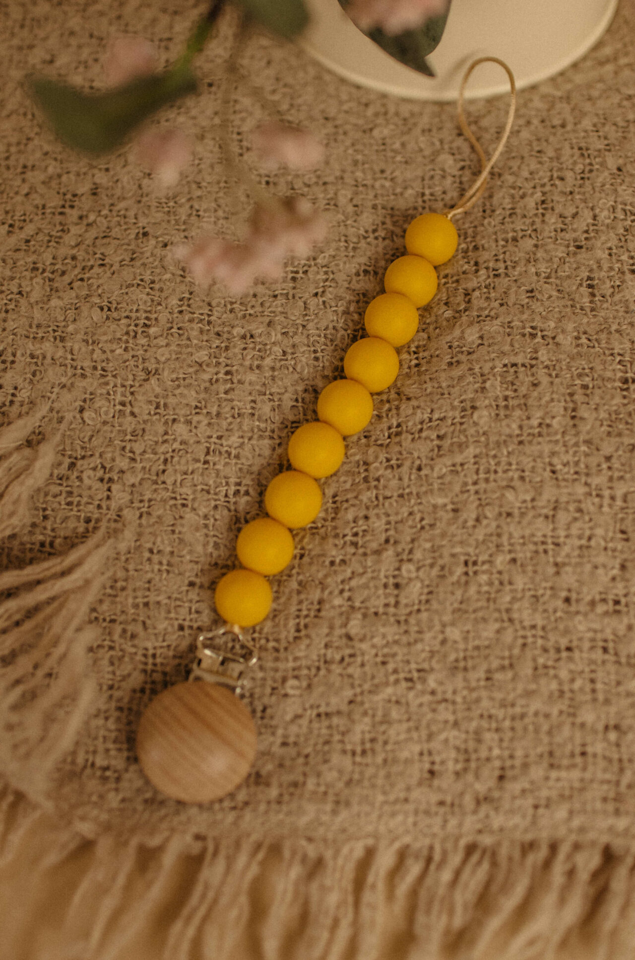 Тримач виготовлений із кульок харчового силікону з дерев'яною кліпсою. Це дуже зручна річ, ви не тільки перестанете шукати соску по дому та постійно мити її на прогулянках на вулиці, але й для дитини під рукою завжди буде додаткова іграшка (прорізувач).