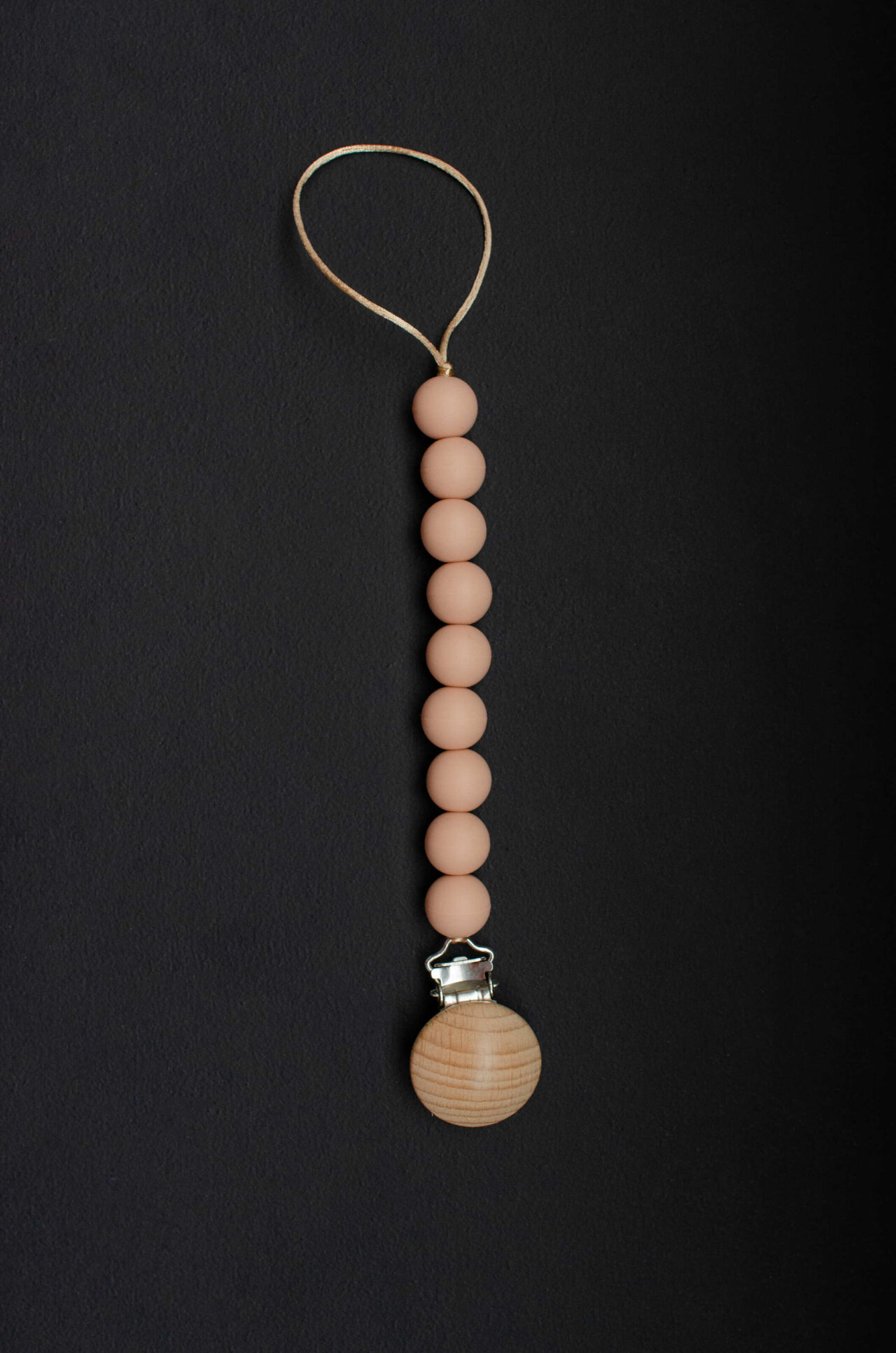 Тримач виготовлений із кульок харчового силікону з дерев'яною кліпсою. Це дуже зручна річ, ви не тільки перестанете шукати соску по дому та постійно мити її на прогулянках на вулиці, але й для дитини під рукою завжди буде додаткова іграшка (прорізувач).