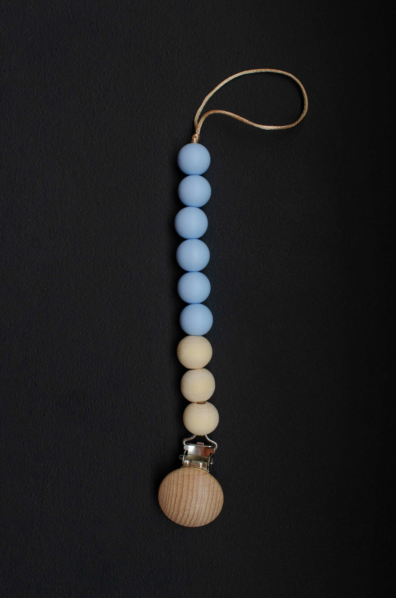 Тримач виготовлений із кульок харчового силікону із вставками дерев'яних кульок. Це дуже зручна річ, ви не тільки перестанете шукати соску по дому та постійно мити її на прогулянках на вулиці, але і для дитини під рукою завжди буде додаткова іграшка (прорізувач).