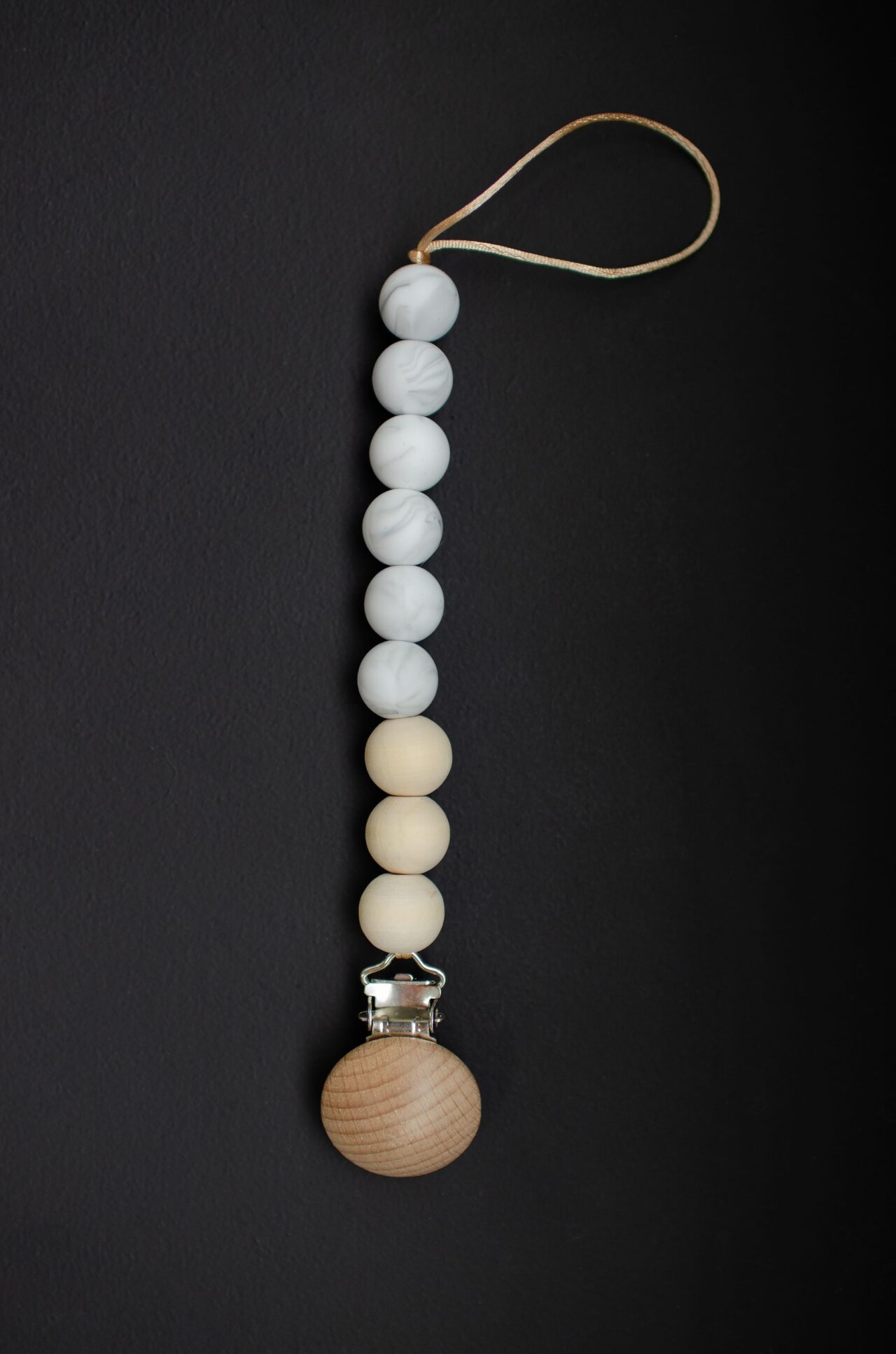 Тримач виготовлений із кульок харчового силікону з дерев'яною кліпсою. Це дуже зручна річ, ви не тільки перестанете шукати соску по дому та постійно мити її на прогулянках на вулиці, але й для дитини під рукою завжди буде додаткова іграшка (прорізувач).