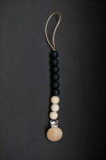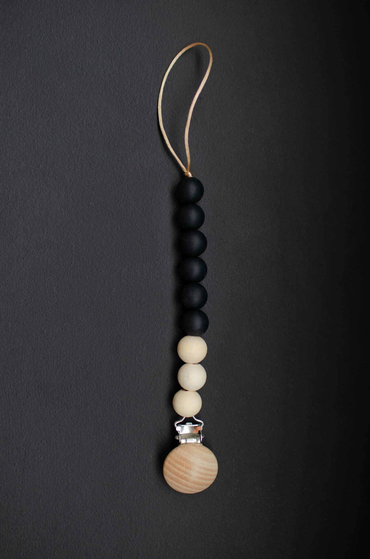 Тримач виготовлений із кульок харчового силікону із вставками дерев'яних кульок. Це дуже зручна річ, ви не тільки перестанете шукати соску по дому та постійно мити її на прогулянках на вулиці, але і для дитини під рукою завжди буде додаткова іграшка (прорізувач).