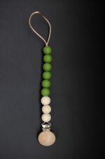 Тримач виготовлений із кульок харчового силікону із вставками дерев'яних кульок. Це дуже зручна річ, ви не тільки перестанете шукати соску по дому та постійно мити її на прогулянках на вулиці, але і для дитини під рукою завжди буде додаткова іграшка (прорізувач).