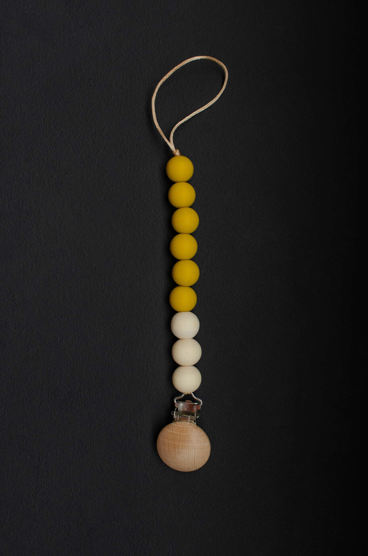 Тримач виготовлений із кульок харчового силікону із вставками дерев'яних кульок. Це дуже зручна річ, ви не тільки перестанете шукати соску по дому та постійно мити її на прогулянках на вулиці, але і для дитини під рукою завжди буде додаткова іграшка (прорізувач).