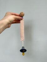 Затискач для пустушки не витримує прання в пральній машині через дерев'яні деталі та металевий затиск. Якщо виріб потрібно почистити, Ви можете точково очистити теплою водою з м’яким милом. Після цього, якщо дерев’яна та металева скоба потрапила у воду, не забудьте ретельно їх витерти. Тримайте металевий затискач відкритим і дайте йому висохнути на повітрі, щоб переконатися, що він повністю сухий.