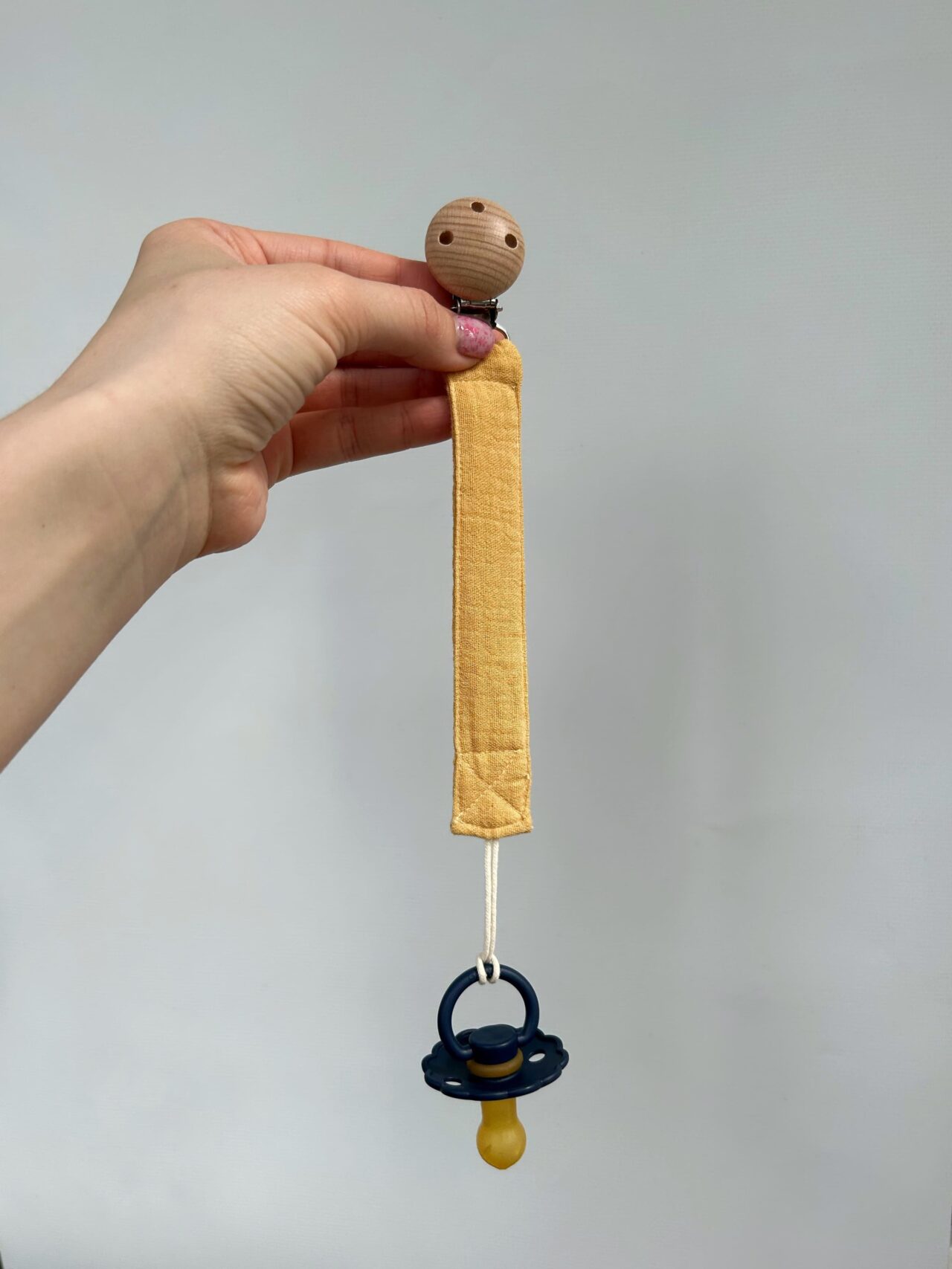Затискач для пустушки не витримує прання в пральній машині через дерев'яні деталі та металевий затиск. Якщо виріб потрібно почистити, Ви можете точково очистити теплою водою з м’яким милом. Після цього, якщо дерев’яна та металева скоба потрапила у воду, не забудьте ретельно їх витерти. Тримайте металевий затискач відкритим і дайте йому висохнути на повітрі, щоб переконатися, що він повністю сухий.