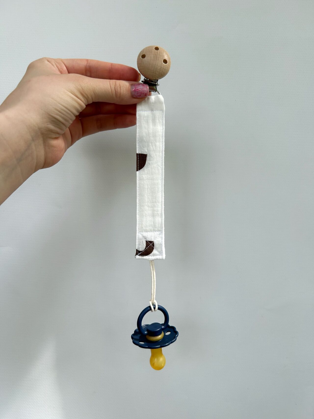 Затискач для пустушки не витримує прання в пральній машині через дерев'яні деталі та металевий затиск. Якщо виріб потрібно почистити, Ви можете точково очистити теплою водою з м’яким милом. Після цього, якщо дерев’яна та металева скоба потрапила у воду, не забудьте ретельно їх витерти. Тримайте металевий затискач відкритим і дайте йому висохнути на повітрі, щоб переконатися, що він повністю сухий.